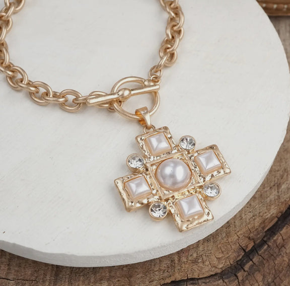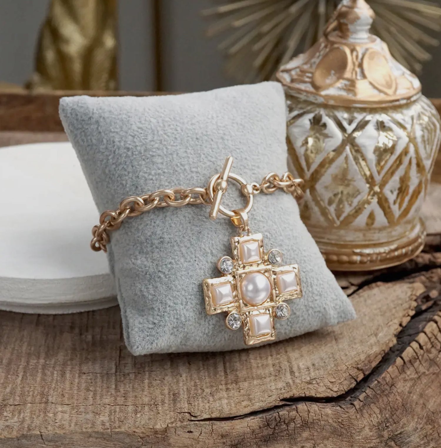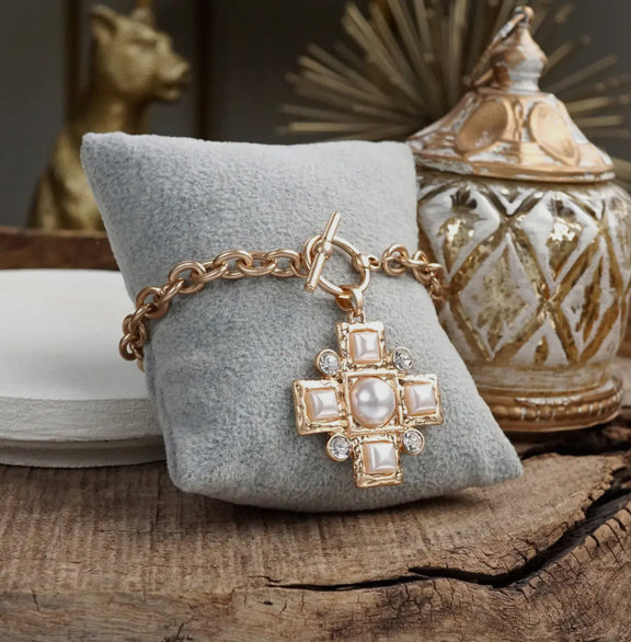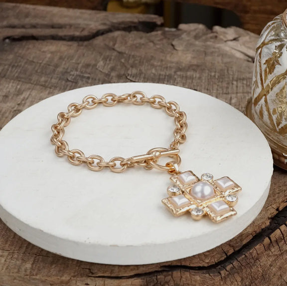 Hammered toggle cross and crystal bracelet. This cable chain bracelet blends texture and sparkle - Ideal for laying or as a standalone statement.