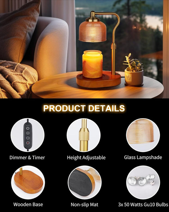 Our wickless candle warming lamp gently melts your favorite HELLO JACKSON wickless candle from the top down, filling your space with fragrance while creating the coziest ambient light. With an adjustable height, dimmer and timer controls, glass shade, and solid wooden base, it’s as beautiful as it is functional—perfect for slow evenings, bedside styling, and worry-free enjoyment.