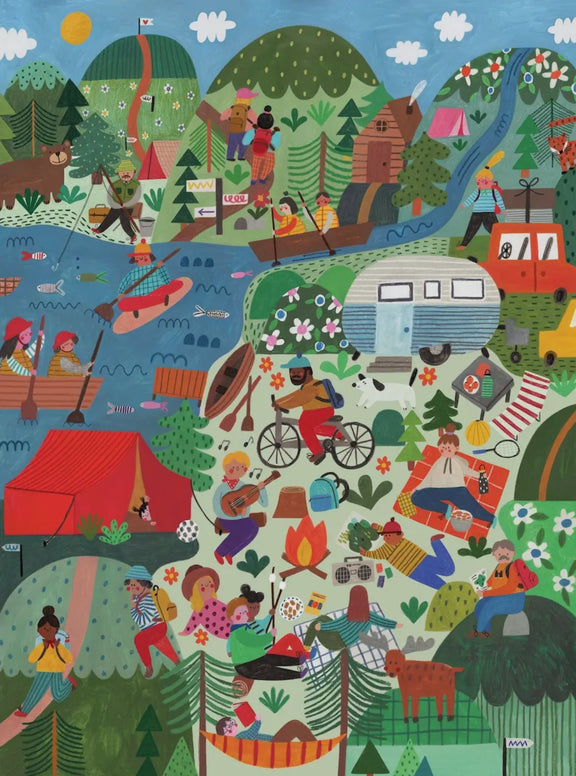A mountain themed puzzle with bright colors & cute elements! In this busy mountain scene you will find hikers, people around a fire, campers, fishers, wildlife, and more!