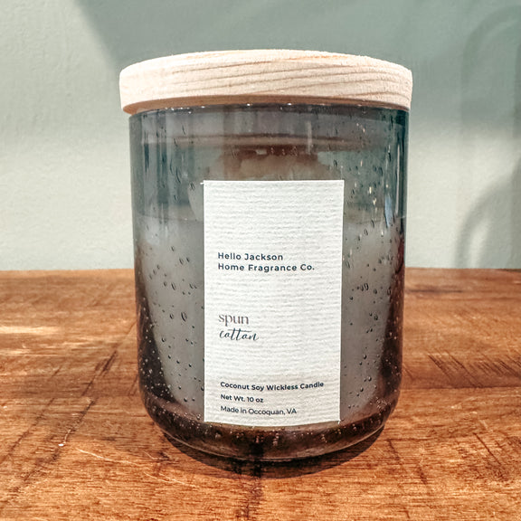 Delicate, nostalgic, and effortlessly soothing, Spun Cotton wraps your space in the warmth of a cherished heirloom. Airy cotton blossom and earthy sage open with a soft familiarity, leading into a textured blend of lavender and patchouli at the heart. The fragrance settles into a tranquil base of golden amber, smooth cedar, and serene palo santo—creating a gently elegant scent that feels like being wrapped in comfort.
